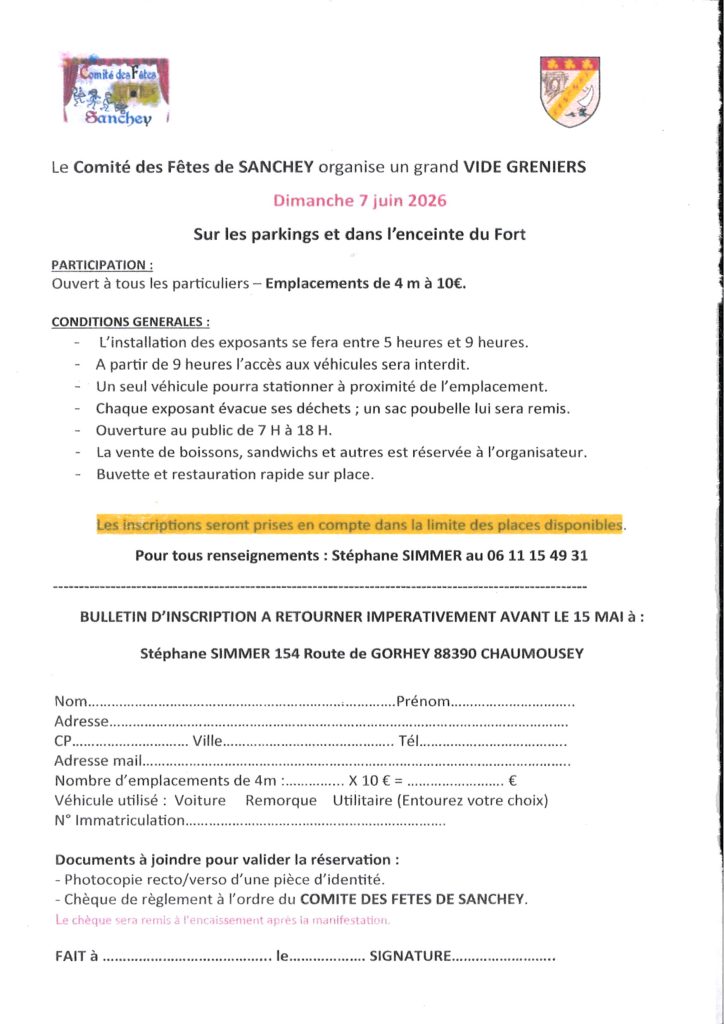 Le Comité des Fêtes organise son vide greniers le 7 Juin 2026 au Fort de SANCHEY.