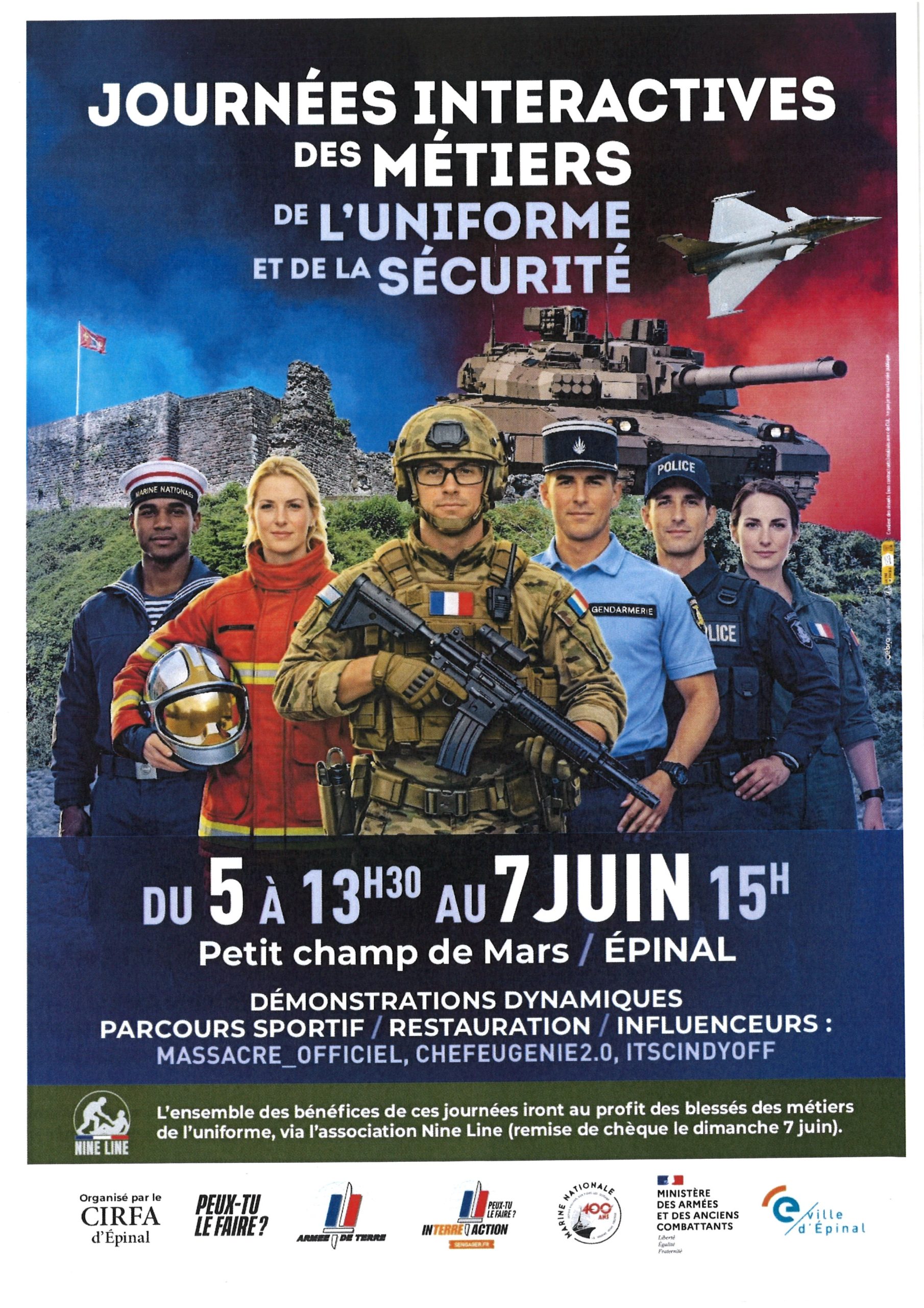 La journée interactive des métiers de l’uniforme et de la sécurité se tient du 5 Juin à 13h30) au 7 Juin (15h) au Petit Champs de Mars à Epinal. Une manifestation unique en son genre qui réuni sur un même lieu les différents métiers militaires. L’occasion unique d’échanger avec des professionnels et de tester les différents ateliers proposés sur place: démonstrations dynamiques, parcours sportif, restauration, influenceurs.