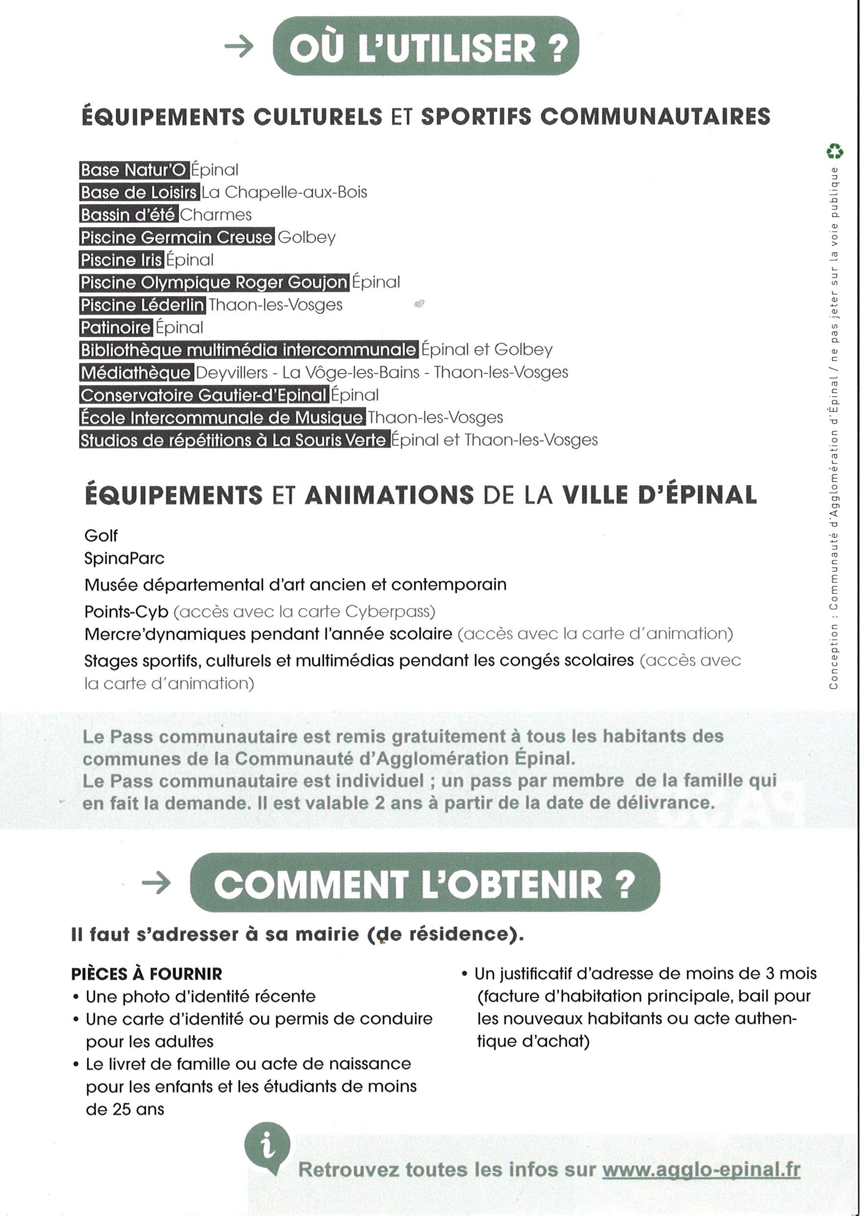 Le Pass Communautaire est remis à tous les habitants des communes de la Communauté d’Agglomération Epinal. Il est valable 2 ans à partir de la date de délivrance.